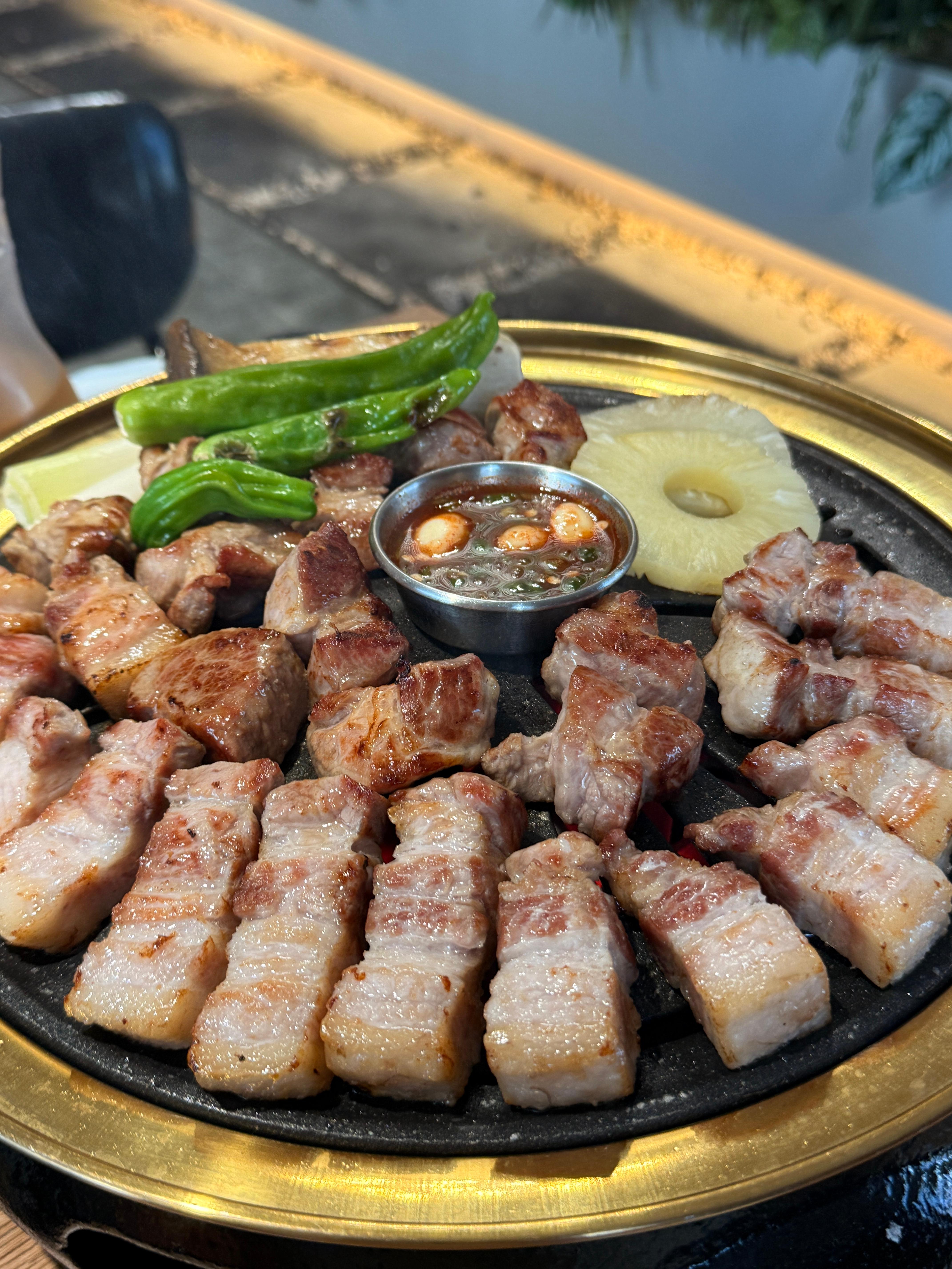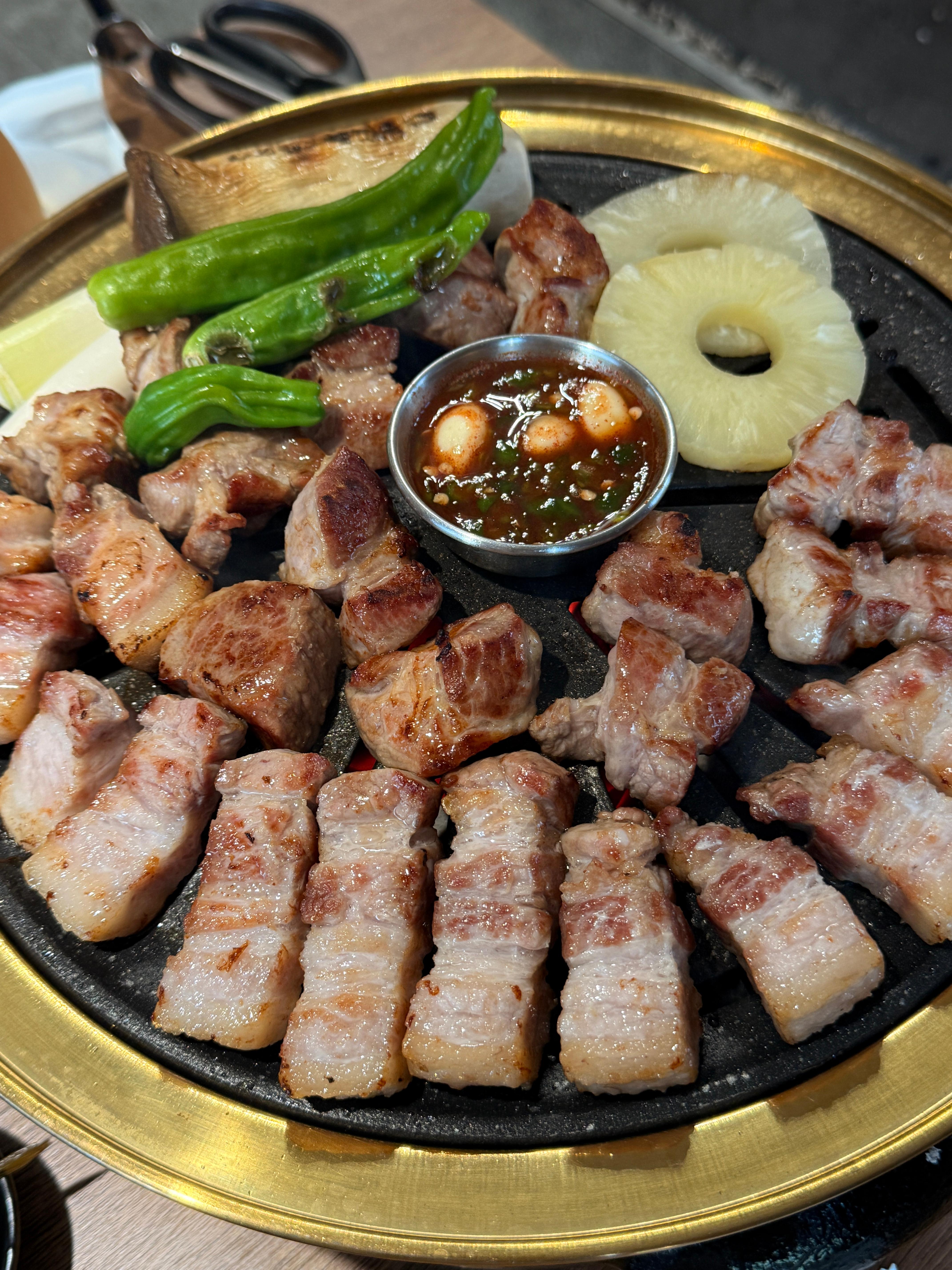 메인 메뉴: 두툼한 생고기부터 바싹 구운 돼지껍데기까지 고급스러운 고기 중심이면서